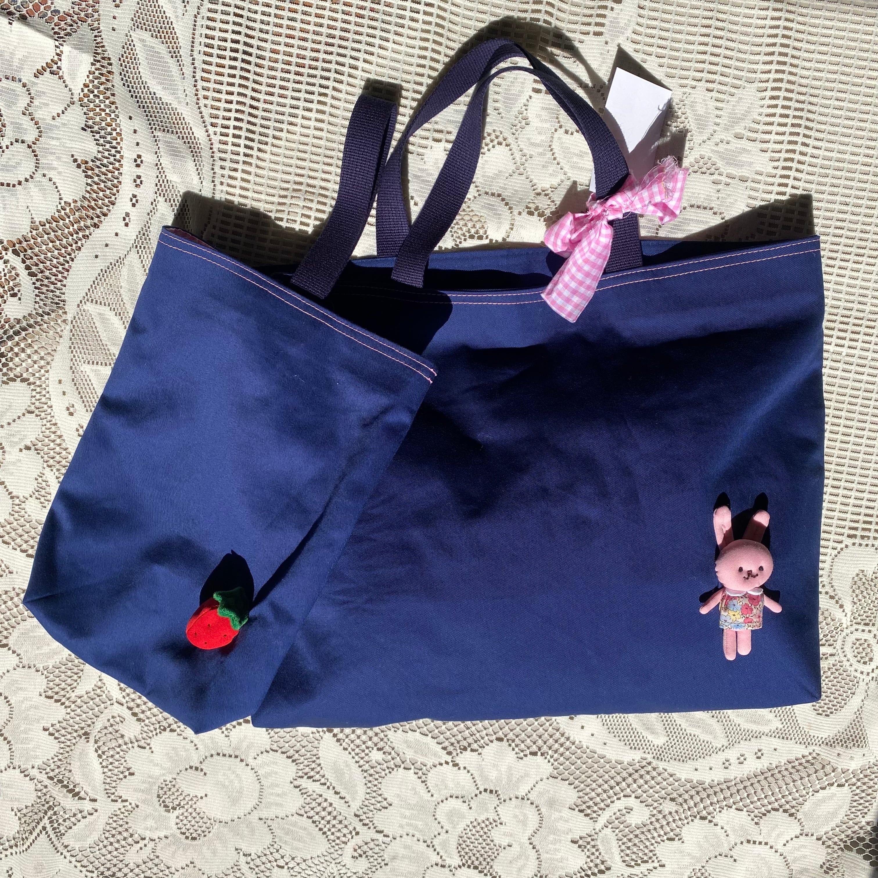 チクチク日和さんの何ともかわいらしいうさぎのぬいぐるみ付きレッスンバッグといちごのぬいぐるみ付きの靴袋のセットです。