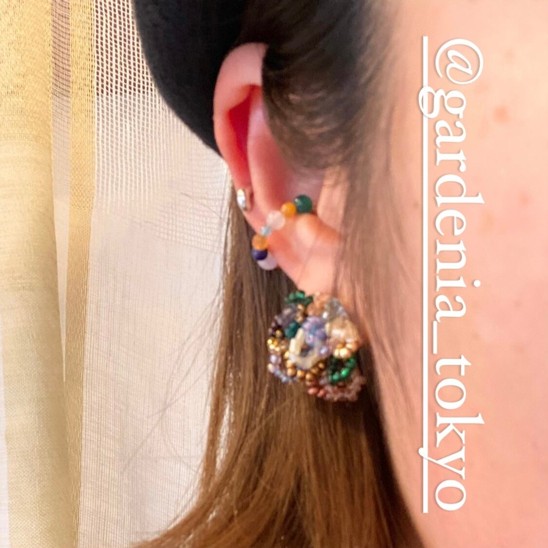 GARDENIAさんの様々なビーズを組み合わせて作られたパール×ストーンイヤカフ。