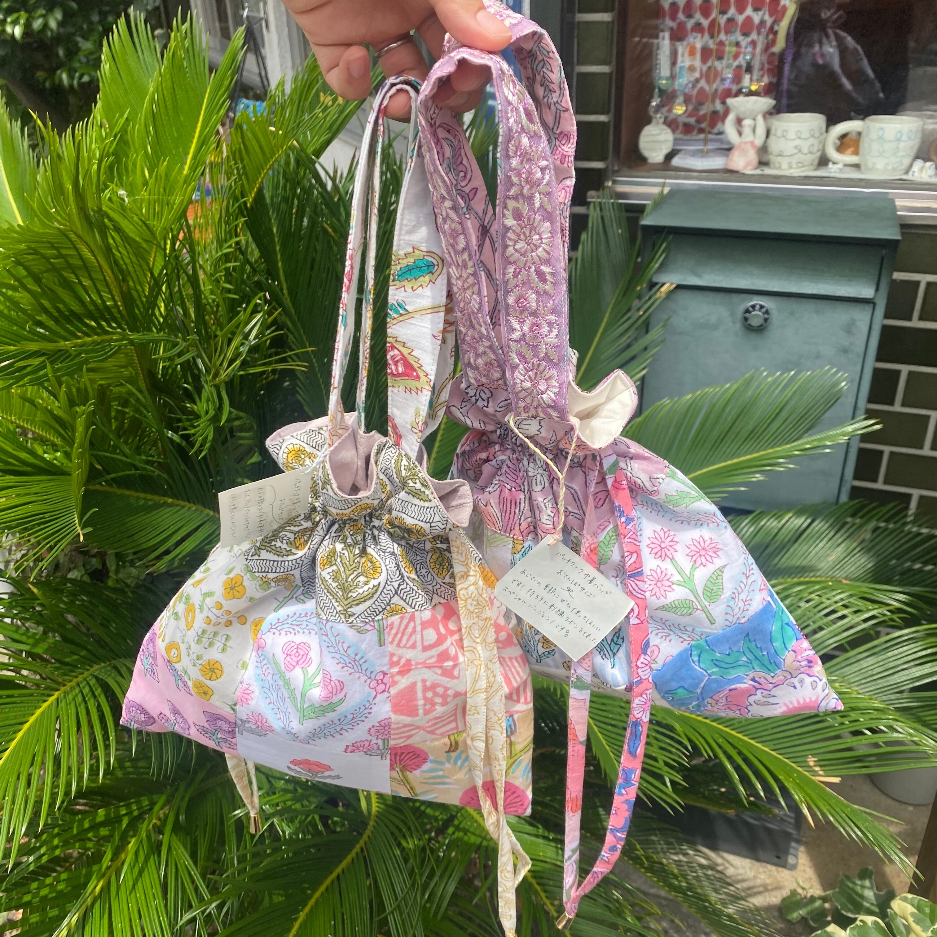 kortoさんのインドのブロックプリントを使用したパッチワークの巾着バッグ。