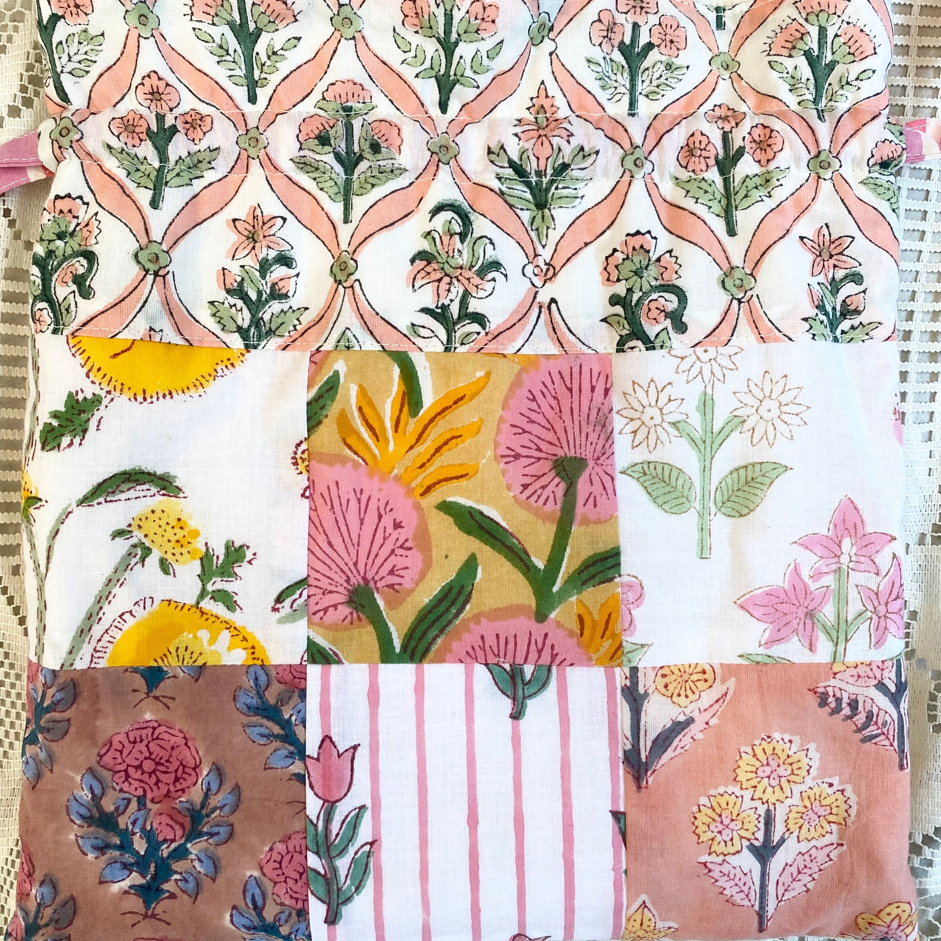 kortoさんのインドのブロックプリントを使用したパッチワークの巾着バッグ。