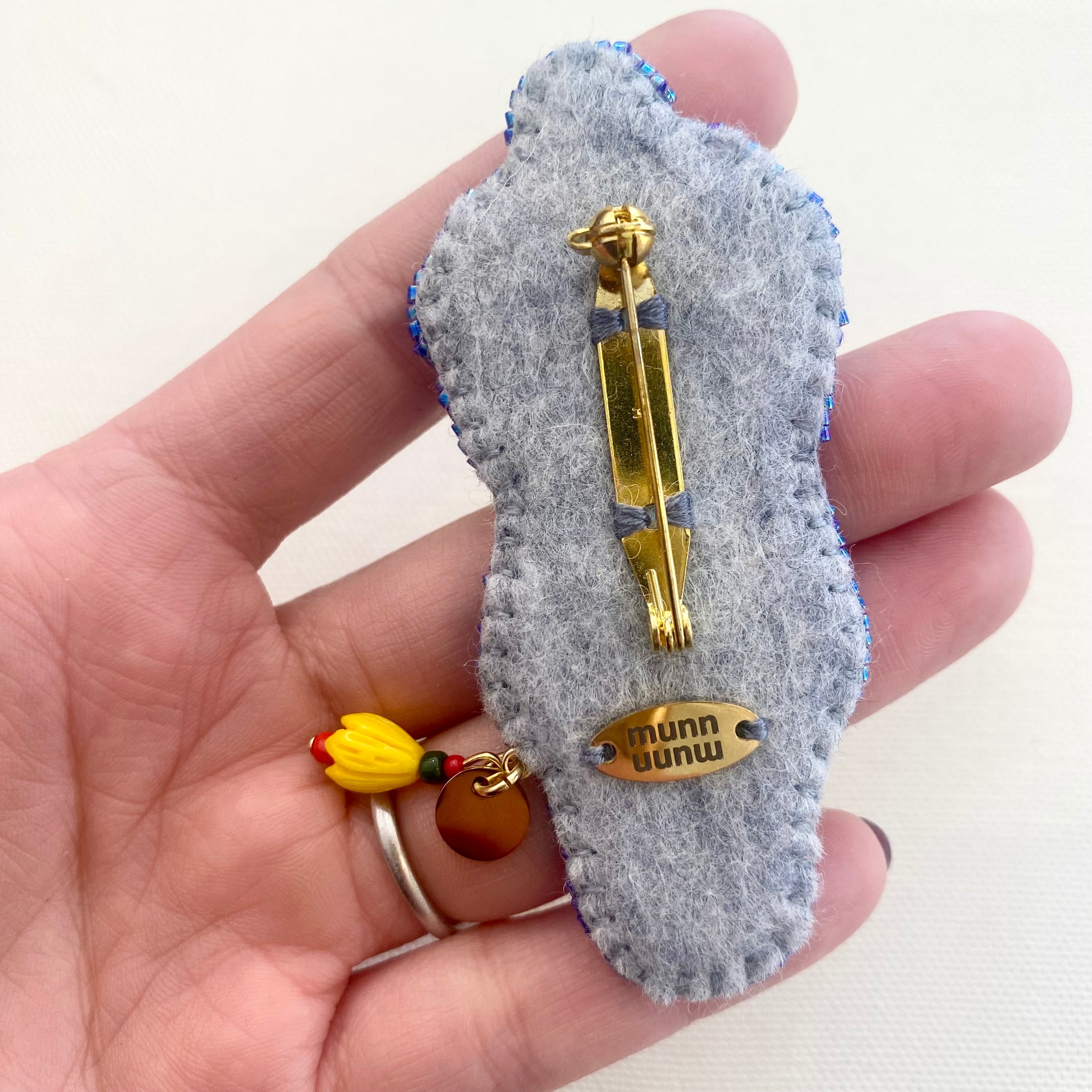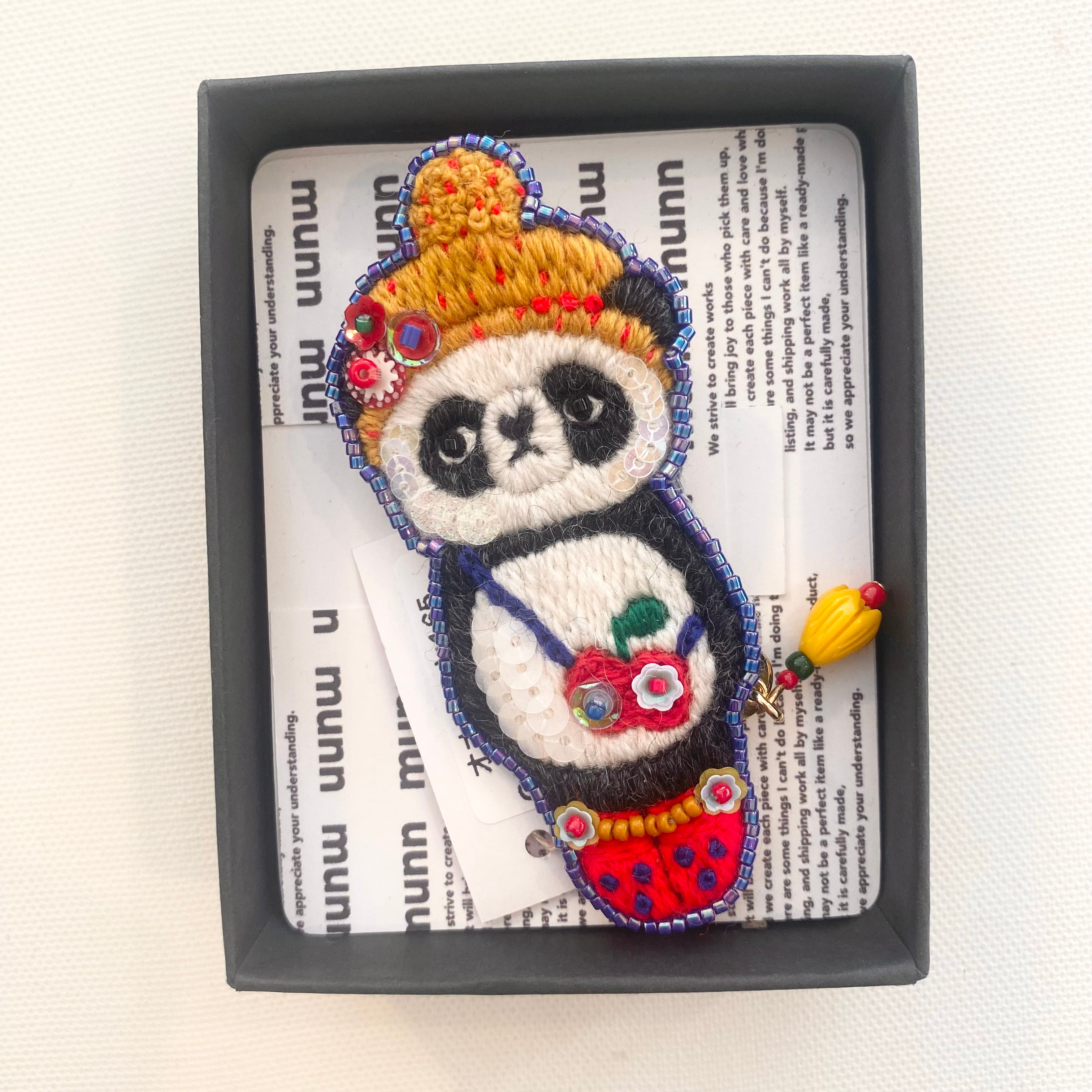 なんとも言えないオシャレなパンダの表情とキラッとビーズや色味がとても可愛い、1点もの。