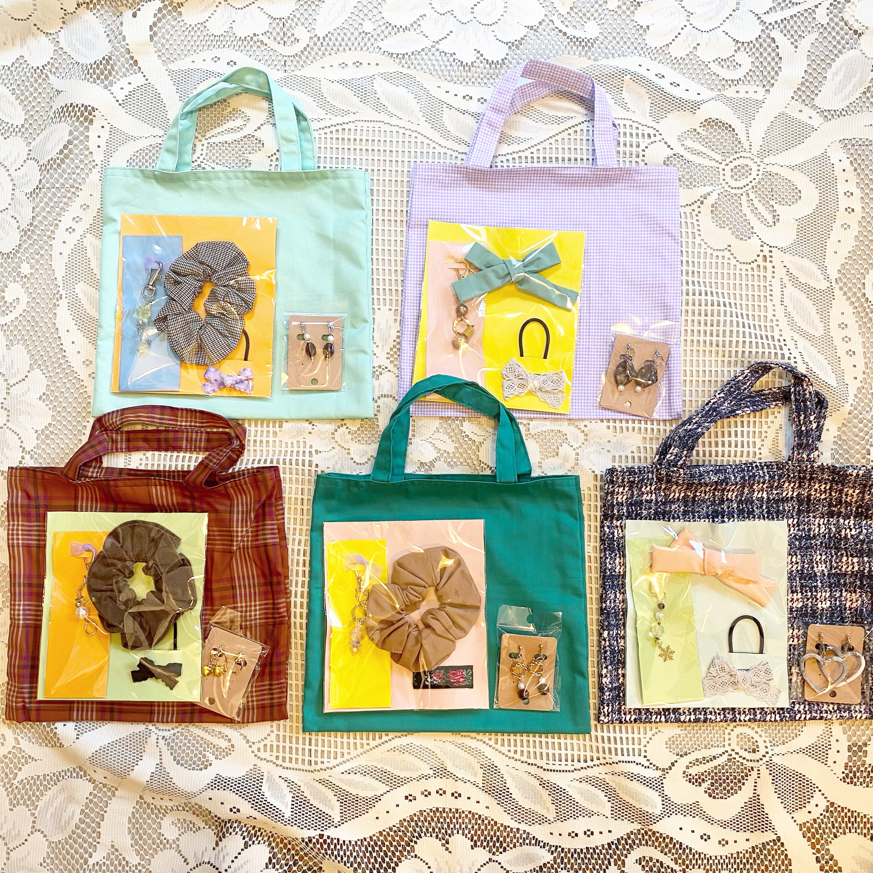 小さなハンドバッグとヘアアクセサリー2点(シュシュ、ヘアゴム、ヘアクリップそれぞれ異なる組み合わせです)、キーホルダー、イヤリングがsetになった嬉しいsetです!